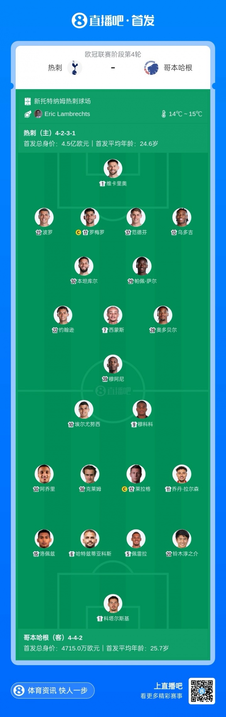 11月5日訊 歐冠聯(lián)賽階段第4輪,熱刺主場迎戰(zhàn)哥本哈根,賽前雙方首發(fā)公布。